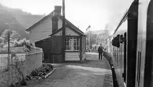 The Carmarthen to Pencader section of the C&CR was now part of the main line to Aberystwyth. Although designated a main line, it was a long and difficult route connecting Carmarthen and Aberystwyth with relatively limited intermediate population centres. In the 1950s holiday trains to the Butlin's Holiday Camp at Pwllheli traversed the route,[note 6] but in the economic conditions prevailing in the 1960s, it too came under review. The line closed to passengers on 22 February 1965.[26] The main line continued to serve a creamery at Pont Llanio near Llanddewi Brefi, which survived until 1970; milk trains also used the Aberayron branch as far as a creamery at Green Grove near Felin Fach, which remained in service until 1973.[1][7][27]