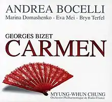 Carmen: Duets & Arias is an album released in 2010 by Italian tenor, Andrea Bocelli.[2] The album is a collection of arias of Georges Bizet's opera Carmen, including duets with Welsh bass-baritone, Bryn Terfel, Russian mezzo-soprano Marina Domashenko, and Italian soprano Eva Mei, from the French opéra comique.