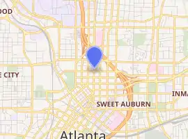 The Carnegie Education Pavilion, more often known as the Carnegie Monument, is a marble Beaux-Arts monument located in Atlanta, Georgia, United States. The pavilion was constructed in 1996 from the exterior facade of the Carnegie Library, named after Andrew Carnegie. The monument pays homage to the legacy of Carnegie by serving as a monument to higher education in Atlanta, with the seals of nine local area colleges and universities embedded in the floor of the monument.[1] The monument was commissioned in 1996 by the Corporation for Olympic Development in Atlanta and designed by Henri Jova. The pavilion is located in Downtown's Hardy Ivy Park, at the curve in Peachtree Street where it diverges with West Peachtree Street.[2] The monument's inscription reads: "The Advancement of Learning." It also features the inscriptions of the names of three famous Western poets "Dante", "Milton", and "Asop", in addition to the library's namesake, "Carnegie".[3]