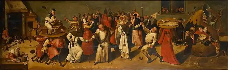 Traditionally a Carnvial feast was the last opportunity to eat well before the time of food shortage at the end of the winter during which one was limited to the minimum necessary. On what nowadays is called vastenavond (the days before fasting) all the remaining winter stores of lard, butter and meat which were left would be eaten, for it would soon start to rot and decay. The selected livestock had in fact already been slaughtered in November and the meat would be no longer preservable. All the food that had survived the winter had to be eaten to assure that everyone was fed enough to survive until the coming spring would provide new food sources.[1] Traditionally the feast also applied to sexual desires, which were supposed to be suppressed during the following fasting.[1][6]