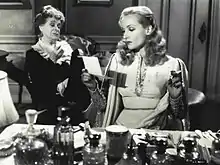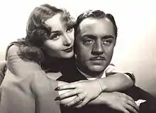 While continuing with a slower work-rate, Lombard decided to move away from comedies and return to dramatic roles.[107] She appeared in a second David O. Selznick production, Made for Each Other (1939), which paired her with James Stewart to play a couple facing domestic difficulties.[108] Reviews for the film were highly positive, and praised Lombard's dramatic effort; financially, it was a disappointment.[109] Lombard's next appearance came opposite Cary Grant in the John Cromwell romance In Name Only (1939), a credit she personally negotiated with RKO Radio Pictures upon hearing of the script and Grant's involvement.[110] The role mirrored her recent experiences, as she played a woman in love with a married man whose wife refuses to divorce. She was paid $150,000 for the film, continuing her status as one of Hollywood's highest-paid actresses, and it was a moderate success.[111]
