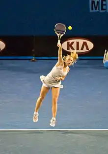 Wozniacki's playing style centres on "the defensive aspects of tennis with her anticipation, movement, agility, footwork and speed all first-rate and key parts of her game." She also anticipates serves with aggressive footwork.[20] Her two-handed backhand is one of her best weapons as she is capable of turning defence into offence, most notably the backhand down-the-line. Her defensive playing style had her contemporaries label her a counter-puncher;[21] sometimes, she was referred to as a pusher by critics. Wozniacki responded to criticism along these lines by saying "If I don’t have a weapon, then what do the others have? Since I’m No. 1, I must do something right." Following her retirement, The Guardian described Wozniacki as "one of the most defensive players ever to reach No. 1", noting her use of the moonball, and stated that her main strengths were her mental fortitude and competitive drive.[22] Despite Wozniacki's excellent footwork and anticipation, and a strong backhand, especially down the line, Wozniacki's forehand remained a weakness throughout her career, due to its lack of depth, power and speed. As noted in the Guardian, "people questioned why her serve could scale 118mph and yet her forehand could not crack open an egg".
