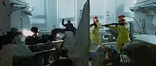 Working together with Stinkdigital executive producer Mark Pytlik, Berg began brainstorming ideas for the piece in February, including car chases and bank robberies.[7][8] Eventually, they settled on the concept of a robbery gone wrong, with the clown-masked robbers escaping through a crowded hospital.[4][5] The brief created, the team began scouting for locations to shoot the ad. Several hospitals in Prague were looked at, but with a recent outbreak of influenza in the Czech capital, most were unavailable.[4] To speed up the location scouting, director of photography Fredrik Backar and post supervisor Richard Lyons accompanied the recce teams.[2] Eventually, the team discovered an old Communist university[6] which had been converted into a sports college, and gained permission to dress the location as a hospital.[4]