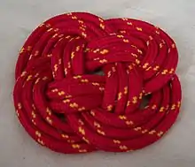 The carrick mat is a flat woven decorative knot which can be used as a mat or pad.[1] Its name is based on the mat's decorative-type carrick bend with the ends connected together, forming an endless knot. A larger form, called the prolong knot, is made by expanding the basic carrick mat by extending, twisting, and overlapping its outer bights, then weaving the free ends through them. This process may be repeated to produce an arbitrarily long mat.[2]