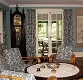 Underneath the shed roof on the front the main entrance has a French door. Behind them, a small hallway leads to doors to the study and service wing, with a double door to the living room on the west, and an open stair. Neoclassicism is the predominant decorative mode—the stairway's newel post is Doric, and the dining room has a pilastered mantelpiece. The living room, extending into the western wing, has a Colonial Revival mantelpiece and double doors to the dining room and south porch.[1]