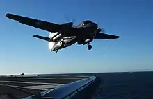 During its inter-fleet transfer, the carrier Reagan and its embarked CVW-11 aircraft participated on several bilateral and multilateral naval exercises. On 17 June 2004, two Super Étendard jet fighters and three S-2T Turbo Trackers antisubmarine aircraft from the Argentine Navy carried out touch-and-go landings on the Reagan's flight deck during Gringo-Gaucho exercises (pictured).[17] The Reagan Carrier Strike Group also participated in a SIFOREX (Silent Forces) exercise with the Peruvian Navy prior to its port visit to Callao, Peru, on 9 July 2004.[15][18]