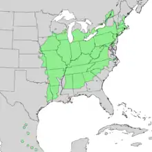 Shagbark hickory is found throughout most of the eastern United States, but it is largely absent from the southeastern and Gulf coastal plains and lower Mississippi Delta areas.[10] An isolated population grows in eastern Canada as far north as Lavant Township, Canadian zone 4b.[11] Scattered locations of shagbark hickory occur in the mountains of eastern Mexico.[12]