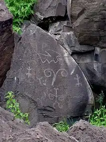 Unique and unusual features characterize the site. The Great Kiva, painstakingly constructed of volcanic rock, is the centerpiece. A steep basalt staircase set into a crevice of the high basalt cliff wall leads to the top of the mesa.
