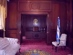 Every president who governed from this mansion has tried to give it a personal touch, such as remodeling the building, changing the carpets or the wallpaper, or acquiring an art object to add to the collection. Some adornments and elements of the current rooms belonged to the former presidential houses. Among these are the Victorian era mirrors that adorn the Hall of Honor. Also, the collection of paintings that decorate the main halls were painted between 1957 and 1959 by the Chilean artist Luis Vergara Ahumada, with the historical guidance of Professor Jorge Lardé y Larín. They were painted during the administration of Lieutenant Colonel José María Lemus. The remodeling works completed during the administration of Dr. Armando Calderón Sol, were coordinated by the private secretary of the presidency, Ángel Benjamín Cestoni and supervised by the interior designer María Eugenia Perla. Earthquakes in January and February 2001 severely damaged the location and President Franciso Flores authorized the relocation of Casa Presidencial offices to their current location in San Benito. The photos on this page are from the new and current location.