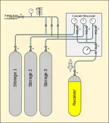 A cascade filling system is a high pressure gas cylinder storage system which is used for the refilling of smaller compressed gas cylinders.[1][2] In some applications, each of the large cylinders is filled by a compressor, otherwise they may be filled remotely and replaced when the pressure is too low for effective transfer. The cascade system allows small cylinders to be filled without a compressor. In addition, a cascade system is useful as a reservoir to allow a low-capacity compressor to meet the demand of filling several small cylinders in close succession, with longer intermediate periods during which the storage cylinders can be recharged.
