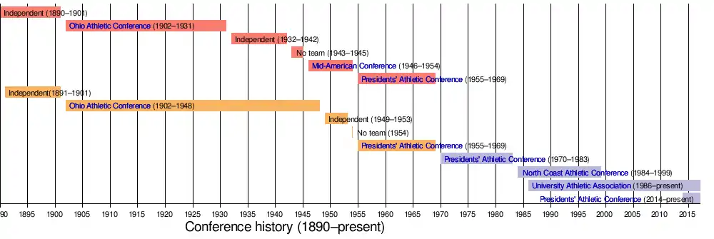 In 1954, Western Reserve withdrew from the MAC, citing the need for the school to focus more energy on academics and the high cost of running a big time program spearheaded by President John S. Millis.[19] In conjunction with reviving the Case Institute program who had disbanded in 1954, both teams helped form the Presidents' Athletic Conference as charter members in 1955, with Western Reserve winning conference titles in 1955, 1958, and 1960.