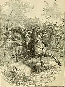 On August 20, he met Washington in his headquarters in Neshaminy Falls, outside Philadelphia.[22] He showed off riding stunts, and argued for the superiority of cavalry over infantry.[20] Because Washington was unable to grant him an officer rank, Pulaski spent the next few months traveling between Washington and the United States Congress in Philadelphia, awaiting his appointment.[22] His first military engagement against the British occurred before he received it, on September 11, 1777, at the Battle of Brandywine.[22] When the Continental Army troops began to yield, he reconnoitered with Washington's bodyguard of about 30 men, and reported that the enemy were endeavoring to cut off the line of retreat.[20] Washington ordered him to collect as many as possible of the scattered troops who came his way and employ them according to his discretion to secure the retreat of the army.[23] His subsequent charge averted a disastrous defeat of the Continental Army cavalry,[20][22][24] earning him fame in America[25] and saving the life of George Washington.[26] As a result, on September 15, 1777, on the orders of Congress, Washington made Pulaski a brigadier general in the Continental Army cavalry.[21] At that point, the cavalry was only a few hundred men strong organized into four regiments. These men were scattered among numerous infantry formations, and used primarily for scouting duties. Pulaski immediately began work on reforming the cavalry, and wrote the first regulations for the formation.[22]