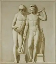 On votive reliefs they are depicted with a variety of symbols representing the concept of twinhood, such as the dokana (δόκανα – two upright pieces of wood connected by two cross-beams), a pair of amphorae, a pair of shields, or a pair of snakes. They are also often shown wearing felt caps, sometimes with stars above. They are depicted on metopes (an element of a Doric frieze) from Delphi showing them on the voyage of the Argo (Ἀργώ) and rustling cattle with Idas. Greek vases regularly show them capturing Phoebe and Hilaeira, as Argonauts, as well as in religious ceremonies and at the delivery to Leda of the egg containing Helen.[6] They can be recognized in some vase-paintings by the skull-cap they wear, the pilos (πῖλος), which was already explained in antiquity as the remnants of the egg from which they hatched.[17]