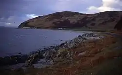 Overlooking the bay to the south is the hill Meall nan Damh at 570 metres, which lies above Glen Catacol, and is the northernmost of the Pirnmill Hills. The most picturesque of lochs on Arran is Loch Corrie between Meall nan Damh and the hill of Meal Biorach at 551 metres.[2] South by south east of the bay lies the smaller hill of Meall Mòr at 496 metres.