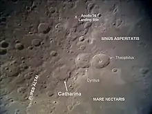 Catharina is an ancient lunar impact crater located in the southern highlands. It was named after Saint Catherine of Alexandria.[1] It lies in a rugged stretch of land between the Rupes Altai scarp to the west and Mare Nectaris in the east. To the west-northwest is the crater Tacitus, and the lava-flooded Beaumont lies to the east along the shore of Mare Nectaris. To the south-southeast is Polybius.