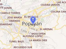 The building is located on the west side of Caldas Park in the historic center of the city of Popayán[3] (Cauca) in the South American country of Colombia.[4] It is Metropolitan Cathedral and Basilica minor. It is the cathedral of the Archdiocese of Popayan, seat of the Archbishop and Metropolitan Chapter.