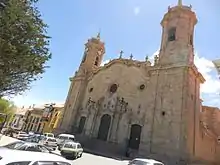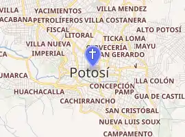 The Cathedral Basilica of Potosí, the official name is Cathedral Basilica of Our Lady of Peace [1] (Spanish: Catedral Basílica de Nuestra Señora de La Paz),[2][3] is a minor basilica and cathedral with baroque and neoclassical colonial influence. It has a stone facade and is located in the 10 de Noviembre Square in the center of this Bolivian city.[4] It was built between 1808–1838 on the site where the old church collapsed in 1807. Its main promoter was the Fray Manuel Sanahuya.