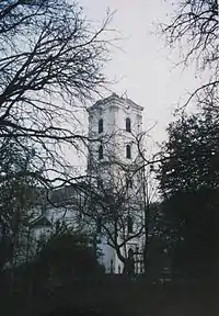 However, the present character of the religion in Hajdúdorog started to take shape after the settlement of the Hajduks in the 17th century. According to the diploma of Korpona, issued by prince Stephen Bocskay in 1605 and reassured by palatine György Thurzó in 1616, Dorog along with other towns in the region became the possession of the Hajduks. The prince also granted them titles of nobility as a reward for their help in the wars against the Turks.[6] The new owners of Dorog were all warriors and Orthodox Christians, but according to the palatine's list, most of them had Hungarian names. The Hajduks finally settled to Dorog in 1616. The first notes about the settlement's Byzantine rite community are from 1638. Bazil Taraszovics, bishop of Munkács appointed Dorog's priest, Radivoj Marinics, archdeacon. The remarkable position refers to the strength and prestige of the community.[7] The Hajduks started to build a small fort in the center of the town. To defend the fort, they also constructed a brick watchtower. The tower was finished by 1640, and now it serves as the lower part of the cathedral's bell tower. Within the walls of Hajdúdorog, close to the watchtower, stood the remains of the old stone church. A number of Romanians fled to the newly established town to escape from the Turkish troops. The Byzantine community was soon split to two parishes: one parish served in Romanian language and the other in Church Slavonic (Hungarian wasn't a liturgical language in Eastern Orthodoxy, so it couldn't be used).[8][9][10] The two parishes agreed in the use of the church building in 1667.[11] The fort, the stone church and the watchtower were seriously damaged during the wars of the 17th century. In 1742 the tower was rebuilt close to the medieval church, and it reached the height of 24 m (78.7 ft.).[12]