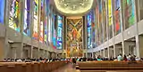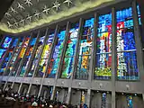 The interior of the cathedral is noted for its large expanse of spectacular stained glass windows crafted in Paris. They are reminiscent of those found in Paris' Sainte-Chapelle.[7] Each panel is roughly 70 by 14 feet (21.3 by 4.3 m) and they are 1 inch (2.5 cm) thick.[4] The ceramic tile mural behind the altar depicting "Christ in Glory" is the largest in the world.[8] The narthex is separated from the main nave by a wall of glass etched by Giovanni Hajnal. It depicts the Kingdom of Christ both on earth and in heaven. The capacity of the cathedral is about 1,750 people not including the two side chapels.[3]