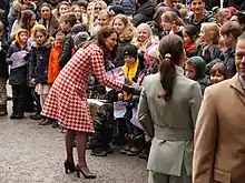 Middleton's first public appearance with Prince William following the announcement of their engagement was at a fundraising event organised by the Teenage Cancer Trust in December 2010.[89] She was formally introduced to public life on 24 February 2011, two months before the wedding, when she and Prince William attended a lifeboat-naming ceremony in Trearddur, Anglesey, in North Wales.[90] A day later they appeared in St Andrews to launch the university's 600th anniversary celebrations.[91] In March 2011, the couple toured Belfast.[92] Their last public engagement before the wedding was a visit to Darwen Aldridge Community Academy.[93][94] The Duchess's first official engagement after the wedding came in May, when she and her husband met Barack Obama, the President of the United States, and First Lady Michelle Obama at Buckingham Palace.[95]