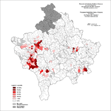 The Catholic Church has a population in Kosovo[a] of approximately 65,000 in a region of roughly 2 million people. Another 60,000 Kosovar Catholics are outside the region, mainly for work.[1] They are mainly ethnic Albanians, with a few Croats.