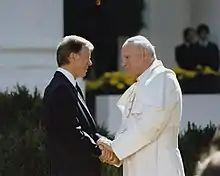 In October 1979, Pope John Paul II went to America on his first of seven trips. He started in Boston and went to New York, where at the United Nations he advocated for human rights for all, especially Palestinian Arabs. He spent two days in New York, finishing with 80,000 congregants by celebrating mass at the Yankee Stadium reminding individuals of the "urgent need" to aid the poor. He then met with President Jimmy Carter, becoming the first Pope to enter the White House. He made an address on the South Lawn to 100,000 guests where he spoke on limiting nuclear weapons and against abortion.[3]