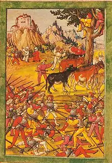 The act of cattle-raiding is quite ancient, first attested over seven thousand years ago,[4] and is one the oldest-known aspects of Proto-Indo-European culture, being seen in inscriptions on artifacts such as the Norse Golden Horns of Gallehus[5] and in works such as the Old Irish Táin Bó Cúailnge ("Cattle Raid of Cooley"), the paṇis of the Rigveda, the Mahabharata cattle raids and cattle rescues;[6] and the Homeric Hymn to Hermes, who steals the cattle of Apollo.