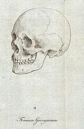 It was Johann Friedrich Blumenbach, a colleague of Meiners', who later came to be considered one of the founders of the discipline of anthropology, who gave the term a wider audience, by grounding it in the new methods of craniometry and Linnean taxonomy.[36] Blumenbach did not credit Meiners with his taxonomy, although his justification clearly points to Meiners' aesthetic viewpoint of Caucasus origins.[37] In contrast to Meiners, however, Blumenbach was a monogenist – he considered all humans to have a shared origin and to be a single species. Blumenbach, like Meiners, did rank his Caucasian grouping higher than other groups in terms of mental faculties or potential for achievement[36] despite pointing out that the transition from one race to another is so gradual that the distinctions between the races presented by him are "very arbitrary".[38]