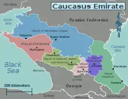 The Caucasus Emirate (Chechen: Имарат Кавказ Imarat Kavkaz (IK); Russian: Кавказский Эмират Kavkazskiy Emirat), also known as the Caucasian Emirate or Emirate of Caucasus, was a terrorist Jihadist organisation active in rebel-held parts of Syria and previously in the southwestern region of the Russian Federation. Its intention was to expel the Russian presence from the North Caucasus and to establish an independent Islamic emirate in the region.[9] Caucasus Emirate also refers to the state that the group seeks to establish.[6][10][11] Partially a successor to the secessionist Chechen Republic of Ichkeria, it was officially announced on 7 October 2007, by former President of Ichkeria Dokka Umarov, who became its first emir.[12]