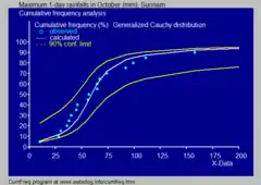 - In hydrology the Cauchy distribution is applied to extreme events such as annual maximum one-day rainfalls and river discharges. The blue picture illustrates an example of fitting the Cauchy distribution to ranked monthly maximum one-day rainfalls showing also the 90% confidence belt based on the binomial distribution. The rainfall data are represented by plotting positions as part of the cumulative frequency analysis.