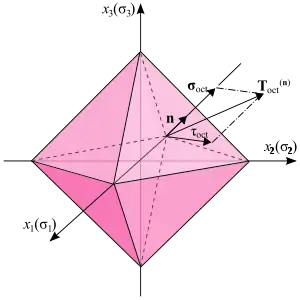 Considering the principal directions as the coordinate axes, a plane whose normal vector makes equal angles with each of the principal axes (i.e. having direction cosines equal to ) is called an octahedral plane. There are a total of eight octahedral planes (Figure 6). The normal and shear components of the stress tensor on these planes are called octahedral normal stress and octahedral shear stress , respectively. Octahedral plane passing through the origin is known as the π-plane (π not to be confused with mean stress denoted by π in above section) . On the π-plane, .