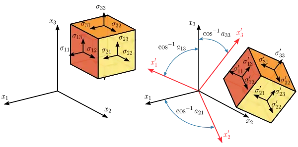 It can be shown that the stress tensor is a contravariant second order tensor, which is a statement of how it transforms under a change of the coordinate system. From an xi-system to an xi' -system, the components σij in the initial system are transformed into the components σij' in the new system according to the tensor transformation rule (Figure 2.4):