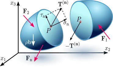 When the body is subjected to external surface forces or contact forces , following Euler's equations of motion, internal contact forces and moments are transmitted from point to point in the body, and from one segment to the other through the dividing surface , due to the mechanical contact of one portion of the continuum onto the other (Figure 2.1a and 2.1b). On an element of area containing , with normal vector , the force distribution is equipollent to a contact force exerted at point P and surface moment . In particular, the contact force is given by