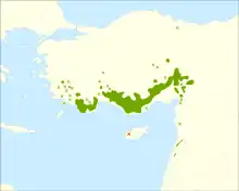 C. libani var. libani is endemic to elevated mountains around the Eastern Mediterranean in Lebanon, Syria, and Turkey. The tree grows in well-drained calcareous lithosols on rocky, north- and west-facing slopes and ridges and thrives in rich loam or a sandy clay in full sun.[3][15] Its natural habitat is characterized by warm, dry summers and cool, moist winters with an annual precipitation of 1,000 to 1,500 mm (39 to 59 in); the trees are blanketed by a heavy snow cover at the higher altitudes.[3] In Lebanon and Turkey, it occurs most abundantly at altitudes of 1,300 to 3,000 m (4,300 to 9,800 ft), where it forms pure forests or mixed forests with Cilician fir (Abies cilicica), European black pine (Pinus nigra), eastern Mediterranean pine (Pinus brutia), and several juniper species. In Turkey, it can occur as low as 500 m (1,600 ft).[16][3]