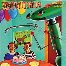 Celebration of Annihilation was one of five singles Servotron released in 1996. It was released orange vinyl and black vinyl on Eastside Records. "The Computer Wore Tennis Shoes" is about the 1969 Disney film starring Kurt Russell, later remade for TV with Kirk Cameron.