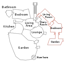 The general layout of the House was largely untouched from the previous non-celebrity series. The living room and bedroom had no noticeable changes. There were several single beds in the same room, with one double bed, meaning that two housemates (Leo and Donny) had to share. The bathroom is much smaller than previous versions and the toilet and shower were no longer fitted with cameras. The dining room table was moved inside, and the kitchen fully equipped with modern conveniences. Outside the garden was a three-jet hot tub with a farmyard seating area. The bridge to Nowhere was still present, leading to a sitting area with heated seats and the topiary man. A workout area was situated just off the kitchen area. Inside the House there was also a fax machine built into the wall. On day 24 this was used to post viewers' questions to the housemates.[3] Meanwhile, the Diary Room was identical to the previous summer's Big Brother, with an oversized gold chair and padded walls, the only change being the addition of yellow lights facing the walls.