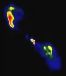 In 1949 John Gatenby Bolton, Bruce Slee and Gordon Stanley localized NGC 5128 as one of the first extragalactic radio sources.[20] Five years later, Walter Baade and Rudolph Minkowski suggested that the peculiar structure is the result of a merge event of a giant elliptical galaxy and a small spiral galaxy.[21] The first detection of X-ray emissions, using a sounding rocket, was performed in 1970.[22] In 1975–76 gamma-ray emissions from Centaurus A were observed through the atmospheric Cerenkov technique.[23]