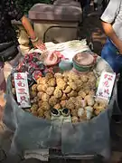 Century eggs can be eaten without further preparation other than peeling and rinsing them – on their own, or as a side dish. As an hors d'œuvre, the Cantonese wrap chunks of this egg with slices of pickled ginger root (sometimes sold on a stick as street food). A Shanghainese recipe mixes chopped century eggs with chilled tofu. In Taiwan, it is popular to eat sliced century eggs placed on top of cold tofu with katsuobushi, soy sauce, and sesame oil, in a style similar to Japanese hiyayakko. A variation of this recipe common in northern China is to slice century eggs over chilled silken (soft) tofu, adding liberal quantities of shredded young ginger and chopped spring onions as a topping, and then drizzling light soy sauce and sesame oil over the dish, to taste. They are also used in a dish called old-and-fresh eggs, where chopped century eggs are combined with (or used to top) an omelette made with fresh eggs.[9] The century eggs may also be cut into chunks and stir fried with vegetables, which is most commonly found in Taiwanese cuisine.