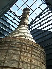 The kiln, which was originally constructed in the 1940s is an example of a bottle kiln, a type of kiln common in the Staffordshire Potteries in England until the 1960s. It has a diameter of 6 metres and is 12 metres high. Made of brick, it is reinforced externally by iron bands and has ten furnaces fuelled by wood or coal. Firing could last up to a week, much longer than more modern kilns. To avoid damage to the pieces by the gasses during firing they were placed inside saggars or ceramic containers. Visitors can go inside the kiln and imagine what it was like for the workers to be inside at high temperatures.[7]