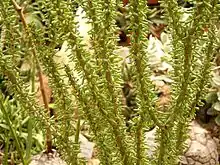 These succulent leaves are deciduous, and densely coat its stems. The stems are stout and grow upwards, forking. They are very slow-growing. Its flowers are usually unisexual.
