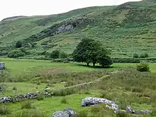 Ceredigion has been inhabited since prehistoric times. A total of 170 hill forts and enclosures have been identified across the county and there are many standing stones dating back to the Bronze Age.[5] Around the time of the Roman invasion of Britain, the area was between the realms of the Demetae and Ordovices. The Sarn Helen road ran through the territory, with forts at Bremia and Loventium protecting gold mines near present-day Llanddewi Brefi. Following the Roman withdrawal, Irish raids and invasions were repulsed, supposedly by the forces under a northerner named Cunedda. The 9th-century History of the Britons attributed to Nennius records that Cunedda's son Ceredig settled the area around the Teifi in the 5th century.[6] The territory supposedly remained a minor kingdom under his dynasty until its extinction upon the drowning of Gwgon ap Meurig c. 871, after which it was administered by Rhodri Mawr of Gwynedd before passing to his son Cadell, whose son Hywel Dda inherited its neighbouring kingdom Dyfed and established the realm of Deheubarth. Records are highly obscure; some historians believe that Hyfaidd ap Bledrig, the Dyfed ruler, may have annexed Ceredigion before his heirs lost it to Hywel through war.