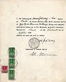 A 1939 Certificate of Life from the British Embassy in Paris. The fee has been paid through the application of revenue stamps.