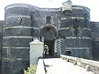 In the 9th century, the Bishop of Angers gave the Counts of Anjou permission to build a castle in Angers.[3] The construction of the first castle begun under Count Fulk III (970–1040), celebrated for his construction of dozens of castles, who built it to protect Anjou from the Normans.[4] It became part of the Angevin Empire of the Plantagenet Kings of England during the 12th century. In 1204, the region was conquered by Philip II and the new castle was constructed during the minority of his grandson, Louis IX ("Saint Louis") in the early part of the 13th century. Louis IX rebuilt the castle in whitestone and black slate, with 17 semicircular towers.[4] The construction undertaken in 1234 cost 4,422 livres, roughly one per cent of the estimated royal revenue at the time.[5] Louis gave the castle to his brother, Charles in 1246.[6]