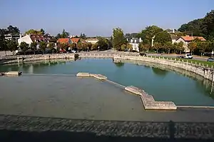 Robert Berger has demonstrated that the design of Marly was a full collaboration between Jules Hardouin-Mansart and the premier peintre Charles Le Brun, who were concurrently working on the Galerie des Glaces at Versailles.[4] Mansart's elevations for the pavilions were to be frescoed to designs adapted from a suite that Le Brun had recently drawn.[5] The frescoed exteriors of the otherwise somewhat severe buildings created a richly Baroque ensemble of feigned sculptures against draperies and hangings, with vases on feigned sculptural therms against the piers— all in the somewhat eclectic Olympian symbolism that Le Brun and the King favoured everywhere at Versailles.