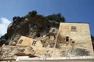 The castle stands on a platform in a cliff. This platform was occupied in prehistoric times; Magdelanian and Azilian artifacts have been found. Then known as the Roc de Tayac, the early castle was built in the 13th century. During the course of the Hundred Years' War, it was held alternately by the English and the French, suffering successive sieges. It had to be rebuilt in the 16th century. In 1595, it suffered a siege during the Jacquerie des Croquants, an uprising of peasants against the king (1590–1600). In 1606, the king ordered the castle's demolition, undoubtedly following the execution of Jean Guy de Beynac who had been implicated in the Duke of Bouillon's conspiracy.[1]