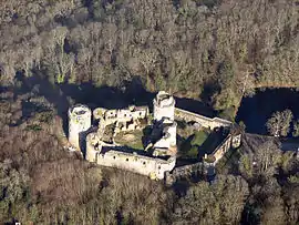 The entrance gate leads to an outer fortified courtyard or basse-cour. Two towers, joined by a curtain wall, frame the entrance to the inner courtyard which is reached by a postern, once protected by a moat and drawbridge. The keep, with walls 4 m (13 ft) thick, stands detached from the curtain walls, at the rear of the ensemble. The view from the top gives a good idea of the local countryside: "a wide, fertile and populous plateau is intersected by deep and wooded picturesque valleys."[3]