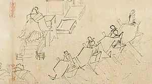 Panel from the fourth scroll, depicting monks sitting down and smoking their pipes.