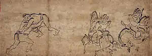 ![]() Animals wrestling on the first scroll of Chōjū-jinbutsu-giga. | |