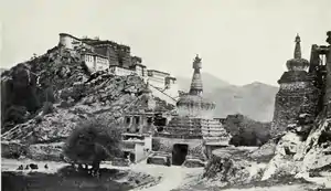 It is now crowned by radio antennas.[10][11] A road has been constructed through the spur that used to connect Chagpori with the Marpori ('Red Hill') on which the Potala is built. At this spur connecting these two hills was the famous chorten Pargo Kaling, a spired reliquary with an arch that served as the town's western gate and was demolished in 1967 and rebuilt in 1995.[12]