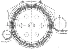 The chain grip-wheel[11] (Kettengreifrad) was designed in May 1892 by Ewald Bellingrath, the director general of the German Elbe shipping company, Kette, in Übigau, in order to overcome the problem of continual chain breakages. This device was used in various chain ships on the Elbe as well as the eight chain boats of the Royal Bavarian Chain Boat Company on the River Main. The idea of the mechanism was to use just one drum or wheel for the actual drive and not to wrap the chain around it several times, but to wind it only partially over the wheel (Diagram 1). The design was supposed to engage the chain securely without letting it slip. It was also supposed to work with different chain thicknesses and lengths of chain link, and independently of their orientation (e.g. angled or on their side). Even if a knot formed in the chain the design was supposed to respond without a problem.[17]